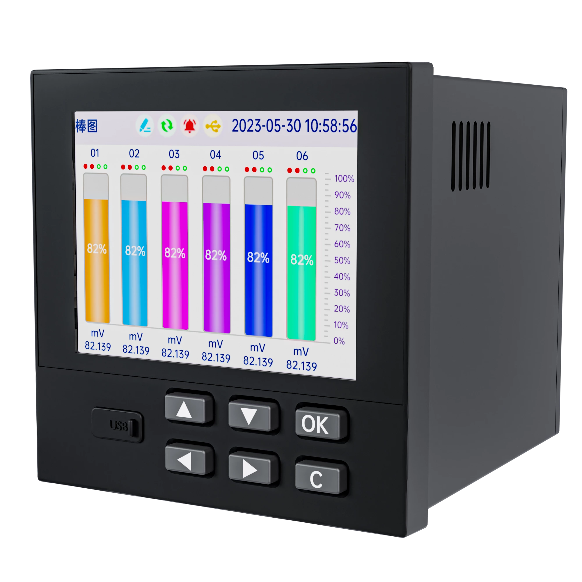This product has a 18-channel analog signal input channel, 4-channel relay alarm output channel, 1-channel150mA distribution output channel,1-channel RS-485 communication interface ,and a USB data dump interface.This product has online firmware upgrade function, which can be done through a USB flash drive or 485 interface. It supports customized writing of the startup interface and screenshot display function.